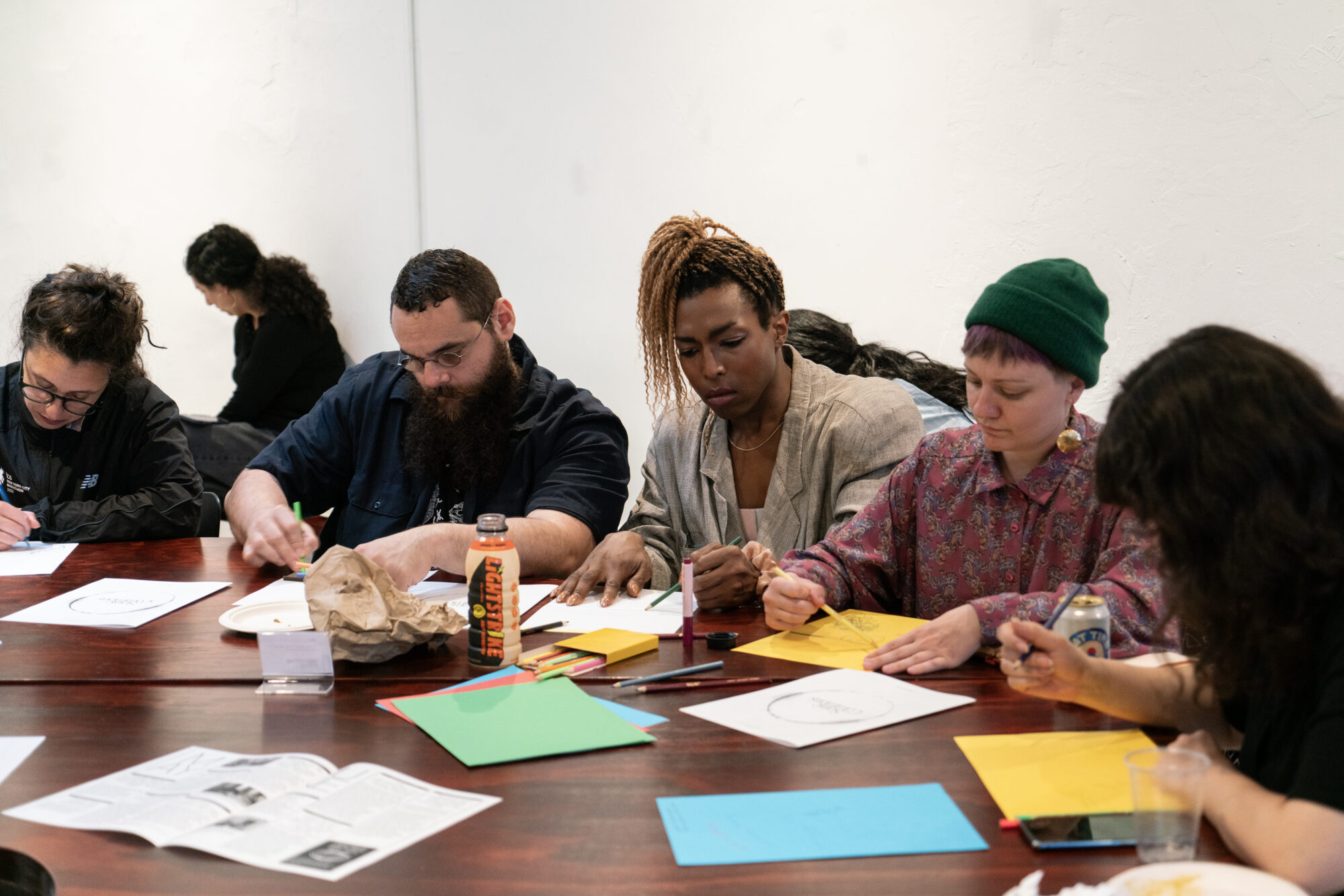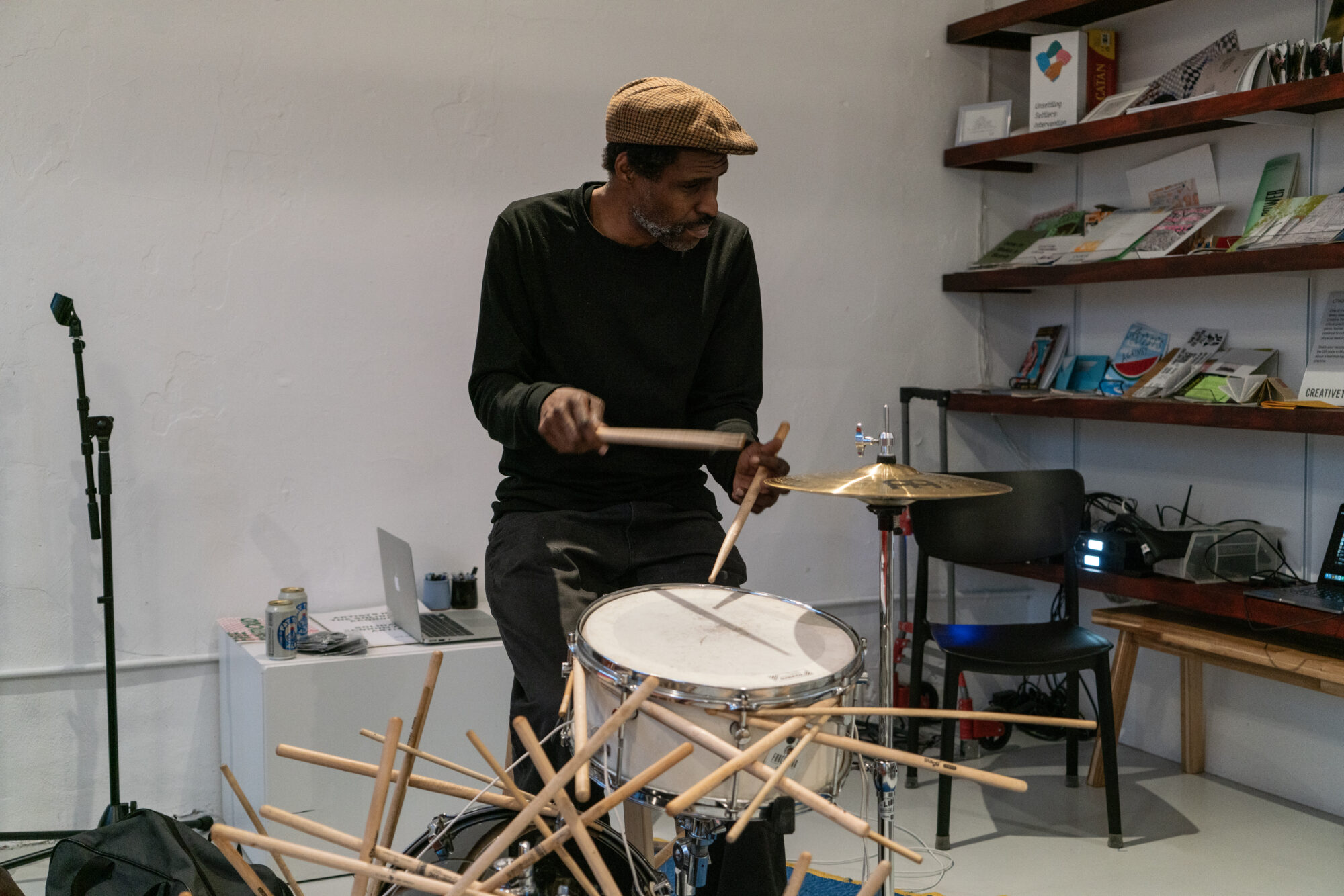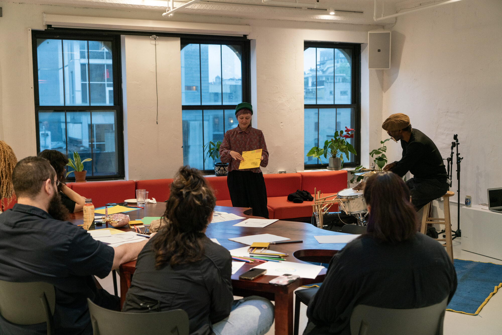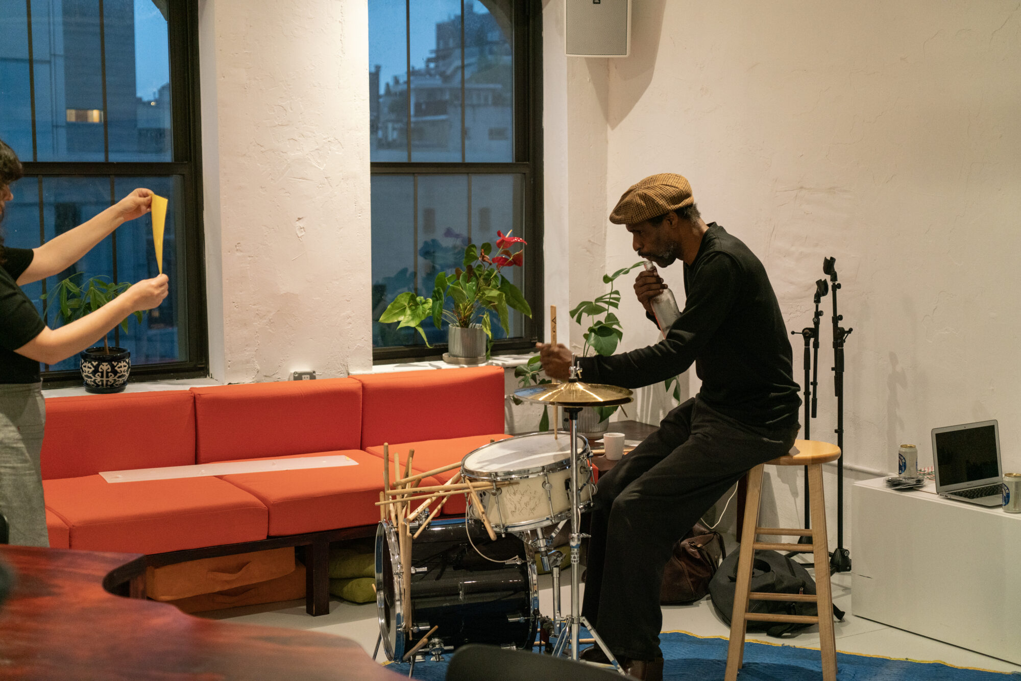 Participants joined Music Research Strategies for a participatory listening engagement which explores metaphors of surveillance management and technologies of resistance, particularly through improvisation techniques. Led by Music Research Strategies, the cultural work persona of Creative Music percussionist Marshall Trammell as well as a community engagement platform, the audience participated as conductors to form an “Insurgent Learning Conductor Ensemble.” The audience became the conductor, and worked with a set of active listening prompts: to listen like lovers, to listen like lawyers, and to listen like wolves. These prompts guided scores for Music Research Strategies’ solo percussion performance, to form an unpredictable and ever-changing narrative.